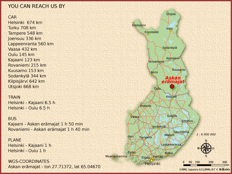 The nearest major cities are Kajaani, 120 km south and Oulu 150 km on the west coast. Both cities can be reached by air, train car and bus e.g. from Helsinki. We are located 24 km north of the city of Puolanka, along highway 78.